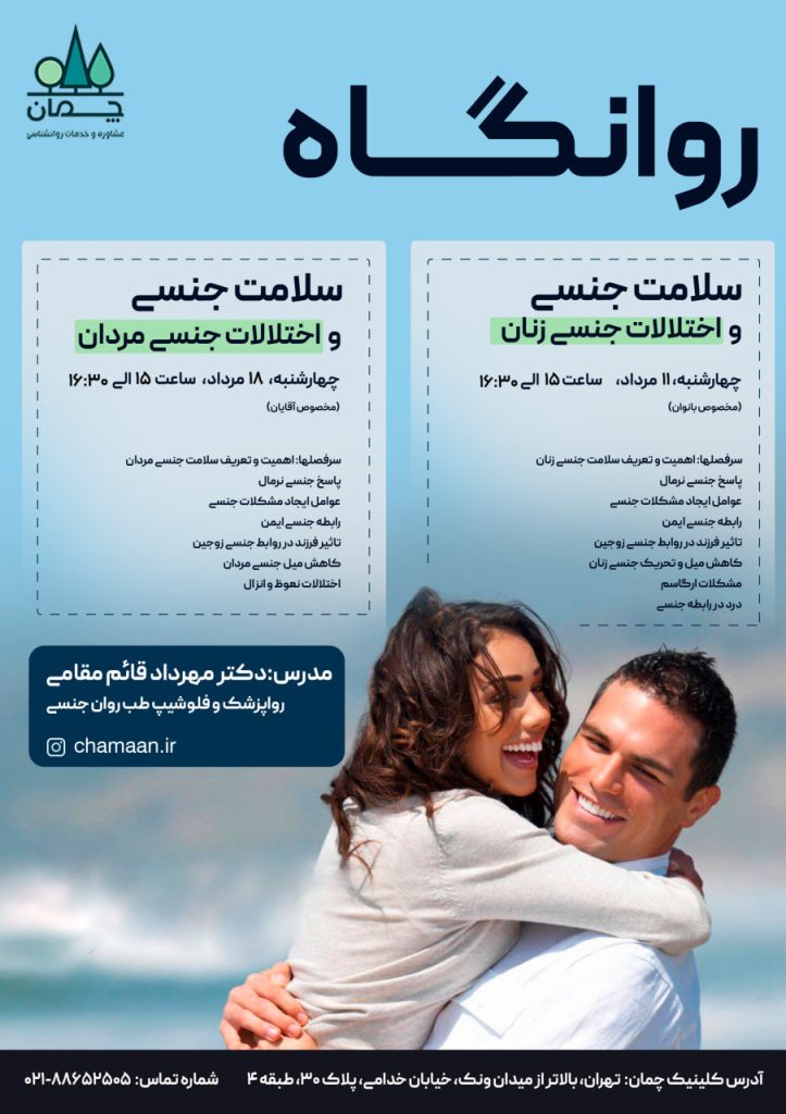 آگاهی از سلامت جنسی از اهمیت به سزایی برخوردار است و به دلیل کمبود تربیت جنسی مناسب در کودکی و نوجوانی این نیاز احساس شد تا برای رسیدن به سلامت جنسی بیشتر، روانگاههای ماه مرداد در کلینیک چمان، به این موضوع اختصاص داده شوند.